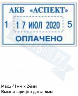 Поле: 41 х 24 мм, высота даты: 4 мм. Корпус: металл, пластик. Со встроенной окрашенной штемпельной подушкой синего цвета.